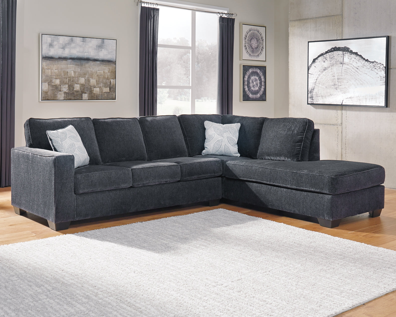 If style is the question, then this sectional is the answer. Sporting clean lines and sleek track arms, the decidedly contemporary profile is enhanced with plump cushioning and a chenille-feel upholstery that's so pleasing to the touch. Sure to play well with so many color schemes, this sectional in slate gray includes a pair of understated floral pattern pillows for fashionably fresh appeal.