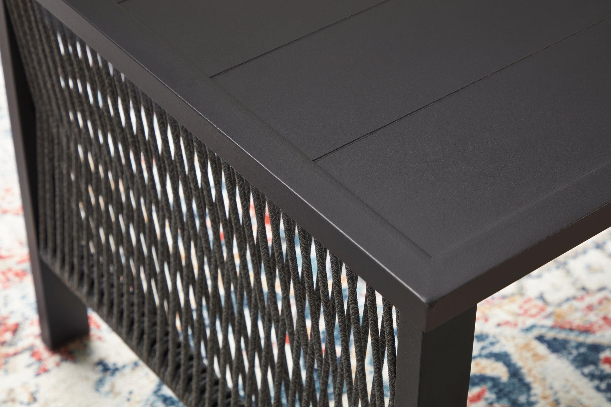 | Details | Includes loveseat, 2 lounge chairs and coffee table, Rust-resistant aluminum frame with durable powder coated finish, Powder coated aluminum resists rusting and fading, Polyester rope, Foam cushion core wrapped in soft polyester for a low-maintenance, comfortable cushion, Solution-dyed high-performance fabric, Nuvella® is an outdoor fabric that can be cleaned and offers enhanced UV resistance, Clean fabric with mild soap and water, let air dry; for stubborn stains, use a solution of 4 oz. bleach to 28 oz. water, Stainless steel hardware resists rust and boosts longevity, Designed to withstand the harsh elements of the outdoors, 2 throw pillows included, Assembly required | |