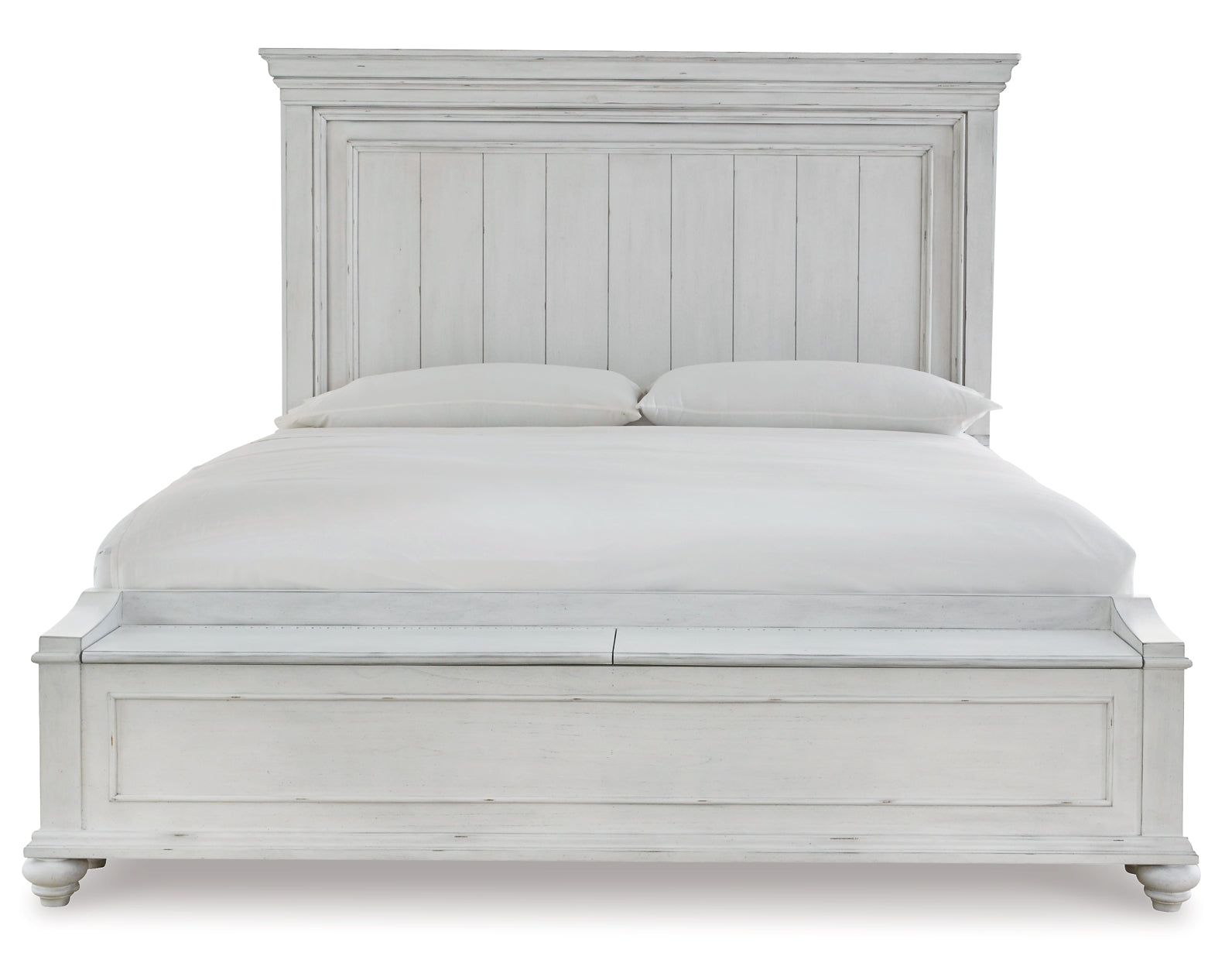 Give your retreat vintage charm with this queen panel bed and storage footboard. In a beautifully distressed whitewash finish, you'll love the headboard's grand style featuring a picture framed panel. The bench footboard is equally elegant offering extra storage and a convenient seat. Generously scaled moulding from top to bottom, along with bun feet give this bed character—evoking the feel of a quaint cottage escape.